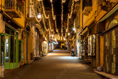 beautiful Christmas holiday street with decorated buildings and bright garlands in a New Year city