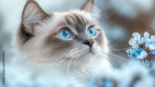 Beautiful close-up of a cat with striking blue eyes and flowers in the background. Generative AI