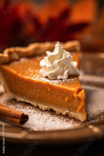 Beautiful close-up of a slice of delicious pumpkin pie indoors, made with generative AI