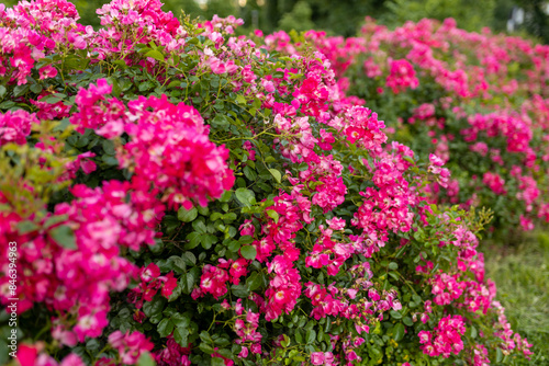 Beautiful closeup photo of a lots of small pink flowers, flowers heads on garden nature background. Gift card. Idyllic park with roses