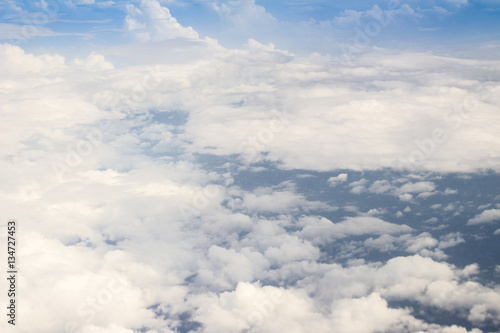 Beautiful cloudscape from sky aerial view. Beauty of nature view from above the sky and clouds. White clouds and blue sky view from airplane window. Sunlight in the sky shines on clouds.