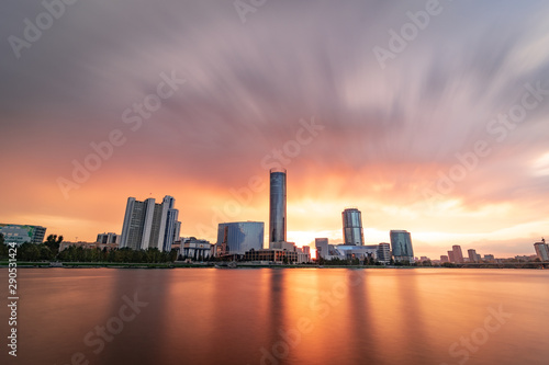 Beautiful cloudy sunset at the city pond. Long Exposure cityscape of Yekaterinburg, Russia with skyscrappers reflecting in water