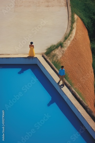 Beautiful coastal blue beach pool house illustration made with Generative AI