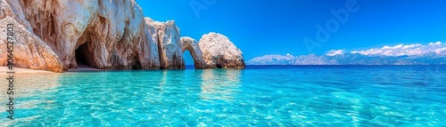 Beautiful coastal landscape featuring clear turquoise water, stunning cliffs, and a bright blue sky, ideal for serene and tranquil imagery.