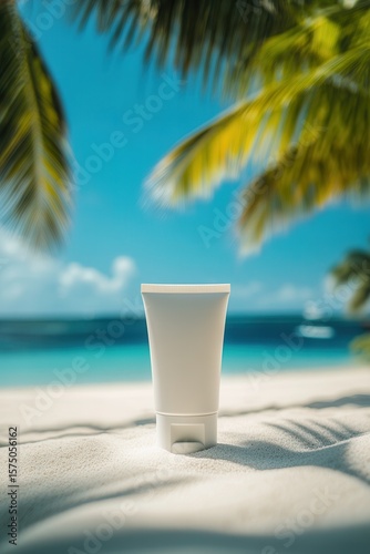 Beautiful coconut oil cream mockup on beach with soft sand and palm trees under clear blue sky
