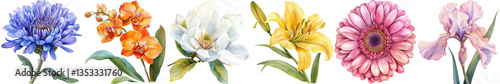 flower, floral, flora, bloom, spring, summer, set, collection, watercolor, hand-drawn, drawing, blossom, nature, beauty, plant, garden, design, colourful, vibrant, aesthetic, art, illustration, botanical, decoration, creativity, texture, freshness, natural, wallpaper, print, vintage, composition, outline, delicate, scenery, detail, handcraft, artistic, visual, inspiration, environment, lily, orchid, daisy, iris, softness