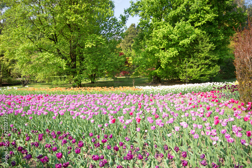 Beautiful, colorful bouquet blooming of tulips fields, spring tulip blossom flowers background.
