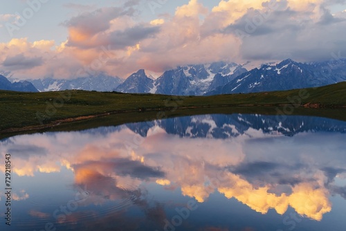 Beautiful colorful sunset on mountain lake Koruldi, clouds reflected in the lake. Upper Svaneti, Georgia. Caucasus mountains.