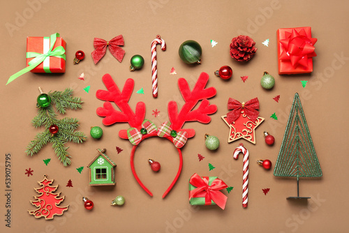 beautiful, christmas, colours, composition, decor, different, accessory, antler, attire, background, brown, card, carnival, children, comic, costume, december, cervid, eve, event, festive, flat, funny, gift, greeting, happy, headband, holiday, hoop, horn, children, lay, little, many, masquerade, new, nobody, object, party, pattern, reindeer, rudolph, santa, texture, top, tree, view, winter, christmas