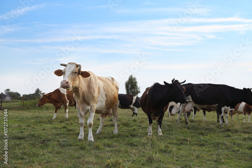 Beautiful cows grazing on green grass outdoors