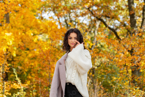Beautiful curly fashion pretty woman with stylish vintage knitted white sweater and coat walks in autumn golden foster