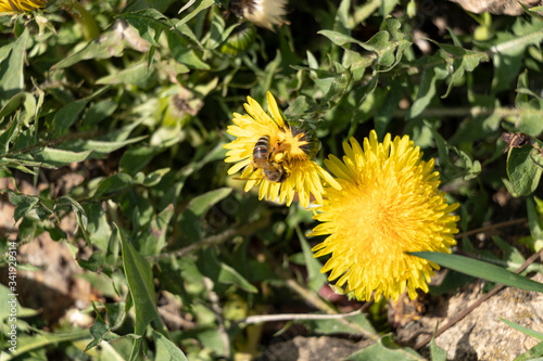 Beautiful dandelions in a spring park. Sunny day. A bee is a collector of nectar. Sunny day.