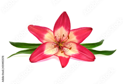 Beautiful delicate pink lily macro with leaf isolated on white background. Wedding, bride. Fashionable creative floral composition. Summer, spring. Flat lay, top view. Love. Valentine's Day