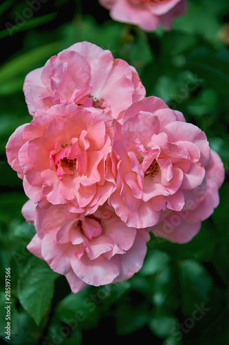 Beautiful delicate pink roses close-up on a dark green background. Rose grows on a bush in the summer.