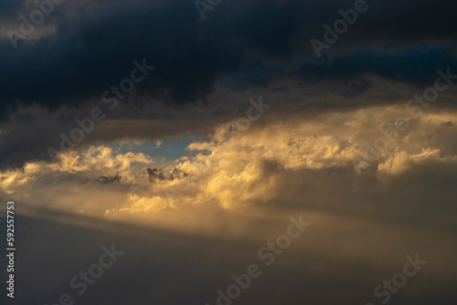 Beautiful dramatic sky with sunbeams through the clouds at sunset