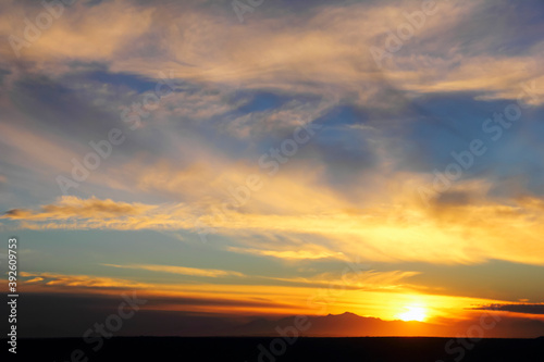 Beautiful dramatic sunset, setting sun, distant mountain range, black desert at the background of blue sky with feather clouds, evening in Maranjab desert, Aran va Bidgol, Iran, Middle East