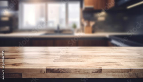 Beautiful empty brown wooden table top and blurred defocused modern kitchen interior background with day light flare, product montage display