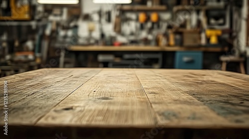 Beautiful empty wooden table top with a blurred, old vintage workshop in the background