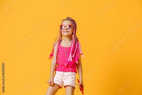 Beautiful European girl with dreadlocks. Mobile phone in the han