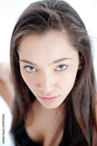 woman, girl, brunette, attractive, beautiful, beauty, young, portrait, closeup, 20, long hair, blue eye, sexy, caucasian, cute, pretty, interesting, fresh, black, tank top, casual attire, isolated, aerial view, eye, stare