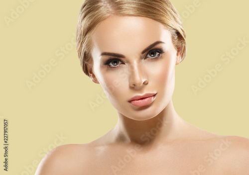 Beautiful eyes lashes woman with blonde hair beautiful and healthy skin woman
