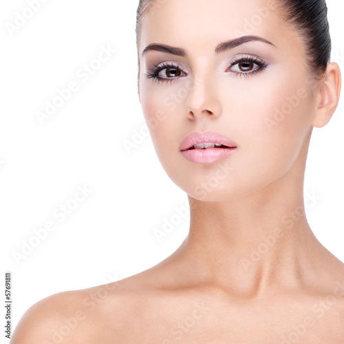 face, woman, beautiful, beauty, skin, portrait, young, care, isolated, pretty, girl, clean, model, fresh, female, attractive, spa, sexy, healthy, front, looking, health, natural, cute, hand, person, closeup, white background, white, adult, caucasian, 1, studio, brunette