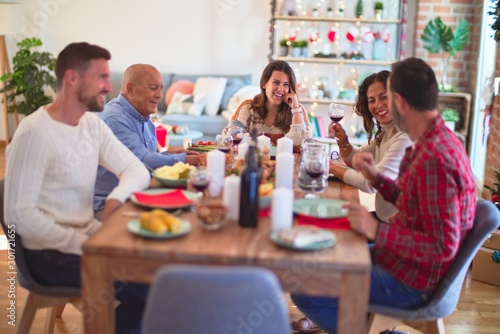 Beautiful family smiling happy and confident. Eating roasted turkey celebrating Christmas at home