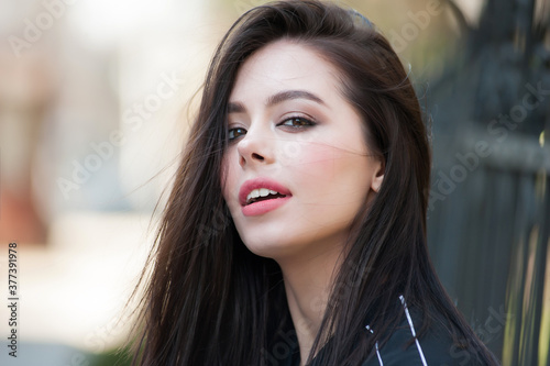 Beautiful fashion woman portrait outdoor with perfect dark hair