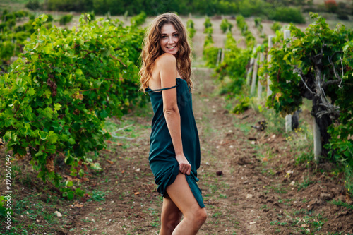Beautiful fashionable woman in dress collects grapes in vineyards