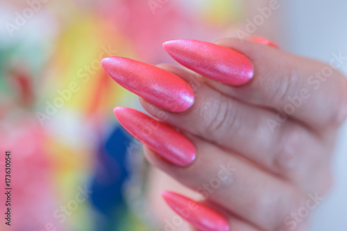 beautiful female hands with long nails and bright neon pink red nail polish