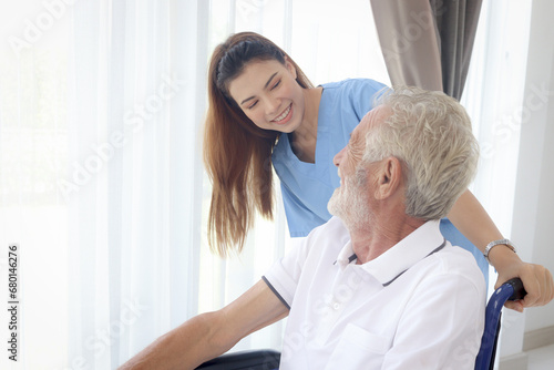 Beautiful female nurse taking care of senior patient in wheelchair at home, disabled elderly man sitting in wheelchair, young woman doctor helping of mature grandfather, nursing medical health care.