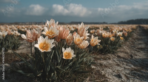 Beautiful field of tulips under a cloudy sky showcasing the beauty of nature
