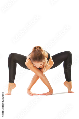 beautiful flexible woman doing yoga poses on white