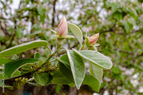 Beautiful floral background. Tender branch with white quince bud and green leaves in the garden on a spring day.