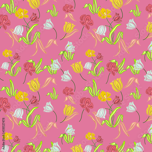 Beautiful floral seamless pattern, opal, English red, old gold color tulip flowers with bitter lime color leaves on china pink color background. wallpaper, textile design.
