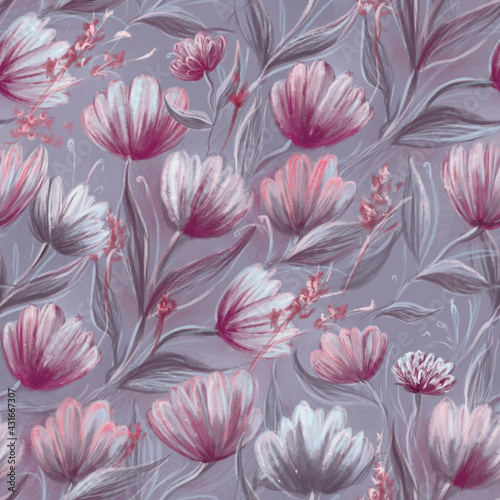 Beautiful floral seamless pattern with hand-painted pink flowers and delicately leaves on the pale lilac color background. Oil painting illustration. For fabric, textile, packaging, wrapping paper.