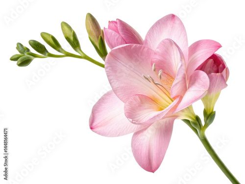 Beautiful freesia flower in soft pink hues showcases delicate petals and budding blooms, evoking sense of tranquility and elegance