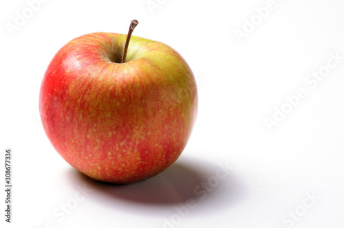 Beautiful fresh red apple on white background with drop shadow. Copy space.