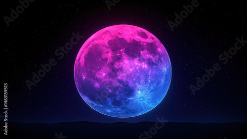Beautiful full moon glowing in a purple and blue night sky filled with shining distant stars
