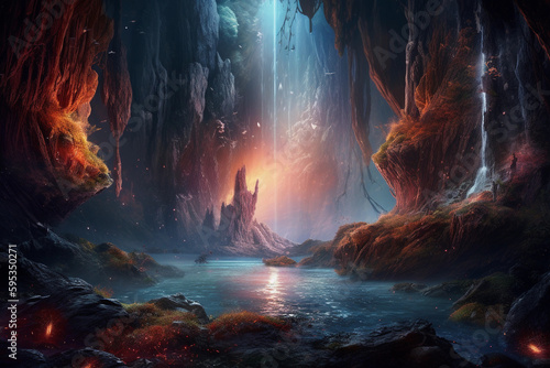 BEAUTIFUL Galactica Fantasy Waterfall Landscape with planets, rock, water, colorful, and beautiful light. IA generated