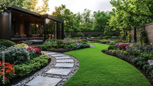 Beautiful garden pathway with vibrant flowers and lush greenery in a serene backyard