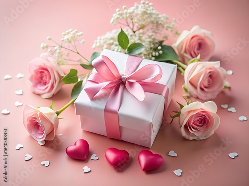 gift, rose, present, flower, valentine, love, nubes, ribbon, birthday, wedding, anniversary, celebration, romantic, surprise, holiday, decoration, floral, bouquet, pink, symbol, day, sweet, arrangement, event, romance, tender, small, miniature, greeting, card, shape, table, nobody, copy, space, studio, shot, closeup, top, view, pastel, soft