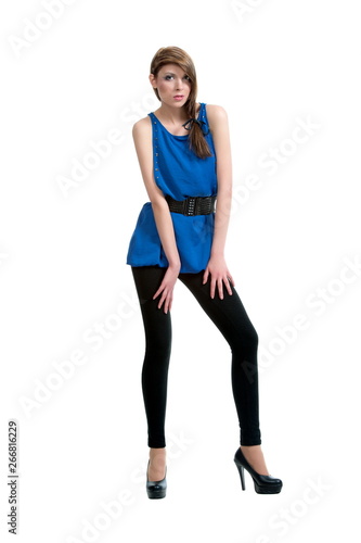belt, adult, attractive, background, beautiful, beauty, blue, body, brown, brunette, casual attire, caucasian, cute, dress, face, fashion, female, girl, glamour, hair, coiffure, happy, head, hot, human, isolated, lady, leather, leg, long, look, luxury, model, people, person, posing, pretty, sensual, sexy, slim, standing, stocking, studio, style, tanned, tight, white, woman, young