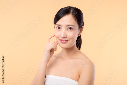 Beautiful girl asian model touching fresh glowing hydrated facial skin on beige background closeup. Beauty face young woman with natural makeup and healthy skin portrait. Skin care concept