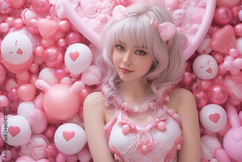 Beautiful girl in a pink bathtub with pink hearts and balloons.valentine concept