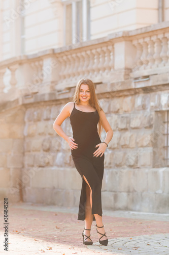beautiful girl in black dress holds hands on waist and smiles. b