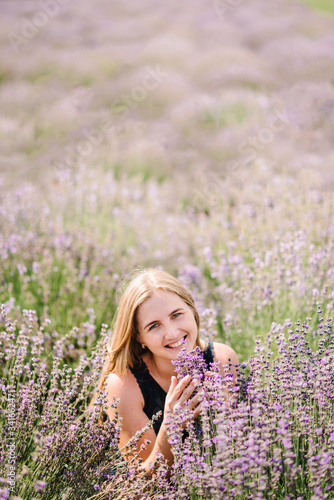 Beautiful girl in dress in purple lavender field. Beautiful woman walk on the lavender field. Girl collect lavender. Enjoy the floral glade, summer nature. Natural cosmetics and eco makeup concept.