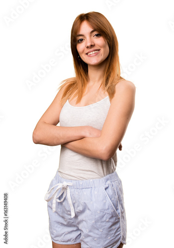 adult, arm, attractive, awake, beautiful, casual attire, caucasian, cheerful, concept, confident, cross, crossed, cute, girl, hispanic, isolated, lifestyle, lovely, morning, pajama, pajama, people, person, pose, pretty, relax, sleep, sleepy, studio, arousing, waking, white, woman, young