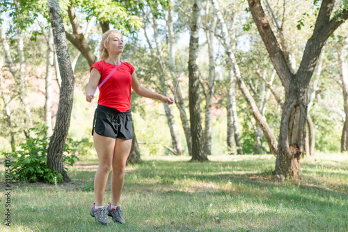 beautiful, caucasian, female, fit, fitness, girl, happy, jumping, jumping rope, lifestyle, nature, park, people, person, young, adult, blonde hair, blonde woman, fashion, healthy, woman, slim