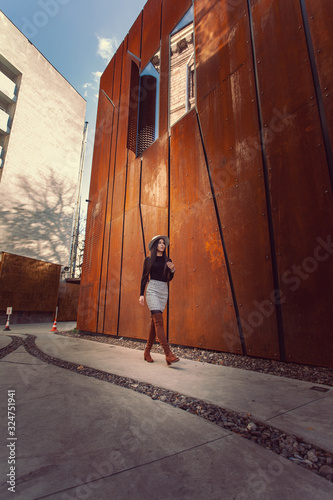background, beauty, building, fashion, girl, lifestyle, street, style, beautiful, brunette, city, clothes, elegant, female, hair, lady, model, modern, people, romantic, sexy, stylish, walk, window, woman, young, adult, attractive, bent, black, blue, business, caucasian, chequered, elegance, face, fashionable, glamour, long, lovely, person, pink lips, portrait, posing, standing, straight, touching, urban, steel